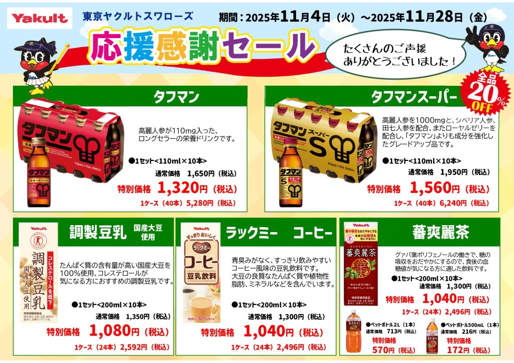 2025/11/04 お知らせ !!応援感謝セール!! 2025年も応援ありがとうございました いつもご愛顧いただき誠にありがとうございます。 応援感謝セールのご案内です。 期間は2025年11月4日(火)~11月28日(金)です。 この機会にぜひご賞味ください。 トピックス一覧に戻る