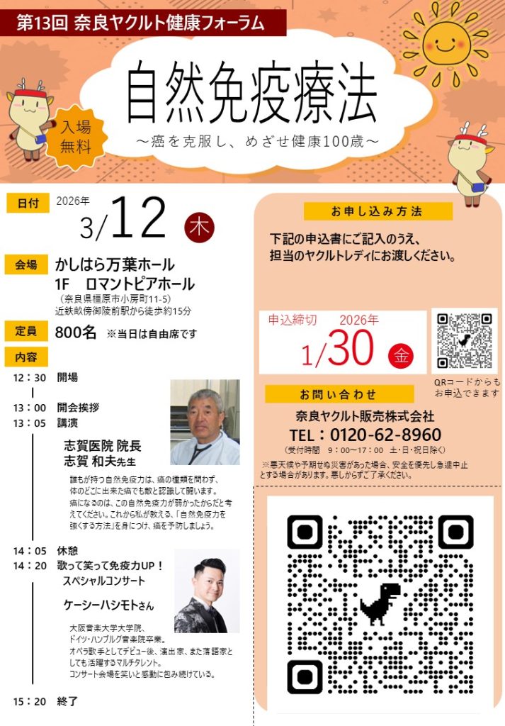 2025/12/30 お知らせ 第13回 ★奈良ヤクルト・健康フォーラムのおしらせ★ スマートフォンの方はこちらからもお申込みいただけます。 皆様のご参加を心よりお待ちしております☻ トピックス一覧に戻る